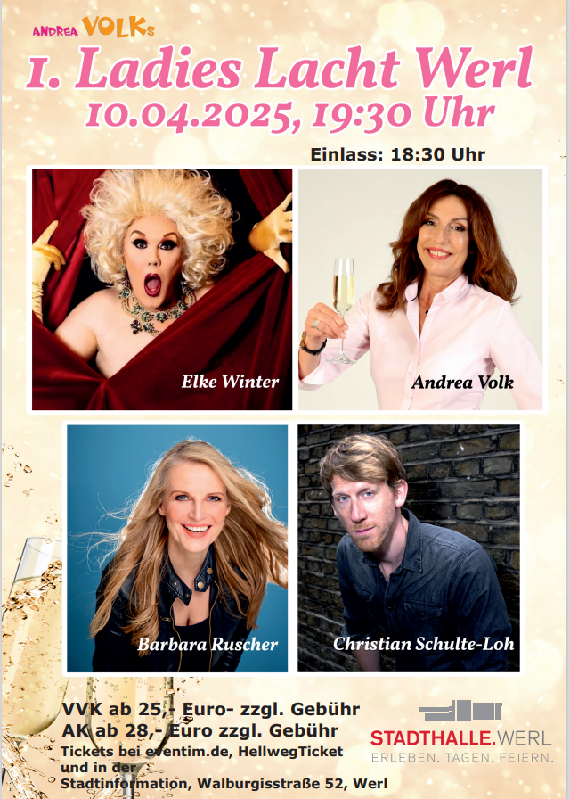 Andrea Volks Kulturveranstaltung feiert Premiere in Werl – Herren herzlich willkommen! Das Ruhrpottkind Andrea Volk, scharfzünging, pointiert und polarisierend, lädt sich großartige Gäaste aus Hamburg, Berlin und Köln ein. Ihre „Ladies Lacht“ ist wie eine große verrückte Familie, in der die meisten Mitglieder weiblich sind, sich weiblich fühlen – oder eben irgendiwe anders – und dann ist auch egal. Lassen Sie sich vom „Marathon an Geistesblitzen“, „treffsicherer Wortkunst“, „eine der besten Kabarettistinnen der Gegenwart!“, wie Andrea Volk von Kulturdezernenten und Presse geurteilt wurde, begeistern. Abgerundet wird die 1. Ladies Lacht Werl von der Queen of Comedy Elke Winter, der Stand-Up Comedy Barbara Ruscher und Komiker Christian Schulte-Loh! Weitere Informationen auf www.stadthalle-werl.de