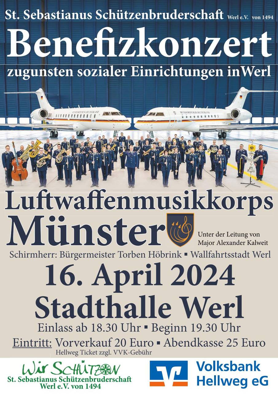 Benefizkonzert zugunsten sozialer Einrichtungen in der Wallfahrtsstadt Werl Die St. Sebastianus Schützenbruderschaft Werl e. V. von 1494 präsentiert am 16. April 2024 das Luftwaffenmusikkorps Münster in der Stadthalle Werl. Unter der Leitung von Major Alexander Kalweit wird ab 19:30 Uhr eine musikalische Reise durch verschiedene Epochen der Musik präsentiert. Die Veranstaltung unter der Schirmherrschaft von Bürgermeister Torben Höbrink wird zugunsten sozialer Einrichtungen in der Wallfahrsstadt Werl durchgeführt. Der Einlass ist ab 18:30 Uhr. Karten können im Vorverkauf (20 € + VVK Gebühr „Hellweg Ticket“) oder an der Abendkasse (25 €) erworben werden. Wir würden uns freuen, wenn Sie durch den Erwerb einer Eintrittskarte unser soziales Engagement unterstützen würden. Link: https://ticketing05.cld.ondemand.com/shop?shopid=6&wes=5c4cfa6a6&query_pos=0&query_rows=1000&set_query_pos=0&houseid=223&performanceid=13401&state=3&nextstate=4