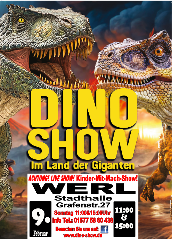 Erleben Sie mit Ihren Kindern, in der 80-minütigen Liveshow, eine fantastische Zeitreise mit Dinosauriern – im Land der Giganten. Dinosaurier hautnah, ein Erlebnis für groß und klein. Die Kinder-Mitmach-Show ist lehrreich und unterhaltend zugleich. Dem neugierigen Publikum wird gezeigt, wie die Welt der Dinosaurier aussah und wie diese wohl lebten; waren es Pflanzenfresser oder Fleischfresser? Es ist ein unvergleichliches Erlebnis, den ausgestorbenen Urzeit-Riesen so nahe zu sein und diese anzufassen und im Anschluss der Show sogar einmal reiten zu können. Die Faszination der Dinosaurier ist seit jeher ungebrochen und begeistert immer noch Jung und Alt. Sichern Sie sich Ihre Eintrittskarten und tauchen Sie mit uns ein ins Land der Giganten (Dino-Show). Weitere Informationen auf www.stadthalle-werl.de