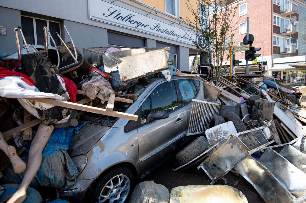 Ein Auto liegt nach dem Hochwasser 2021 unter Trümmern im nordrhein-westfälischen Stolberg.