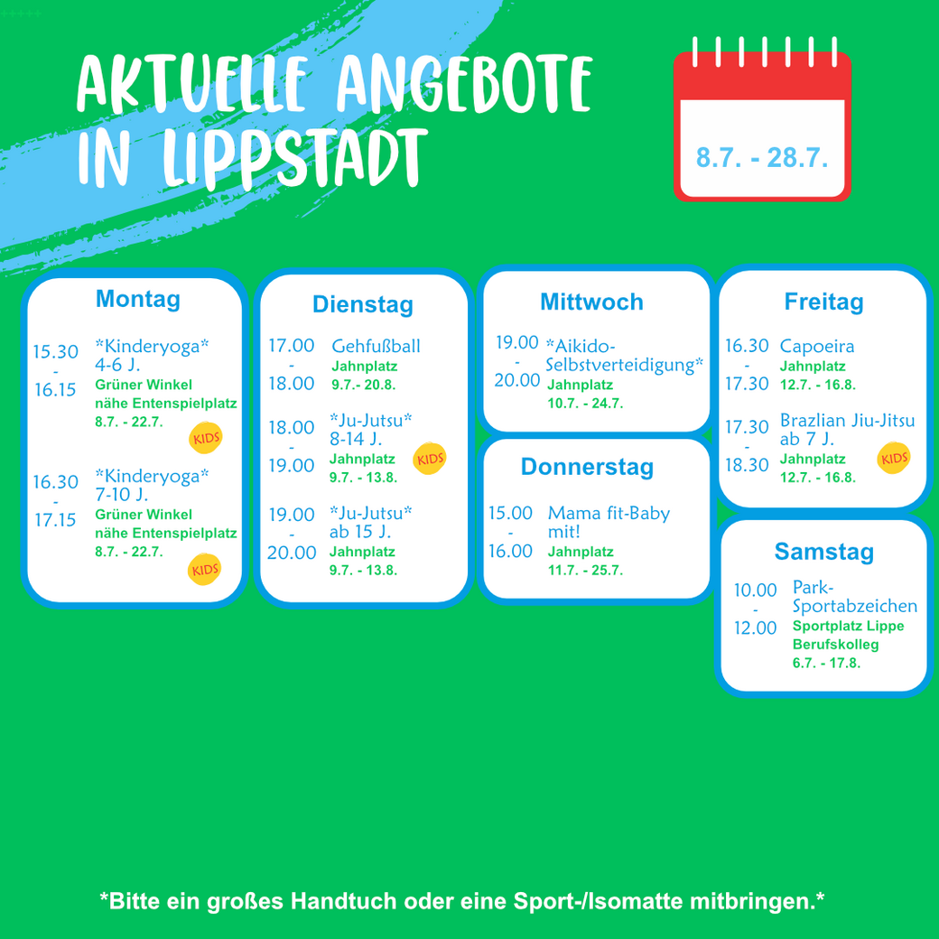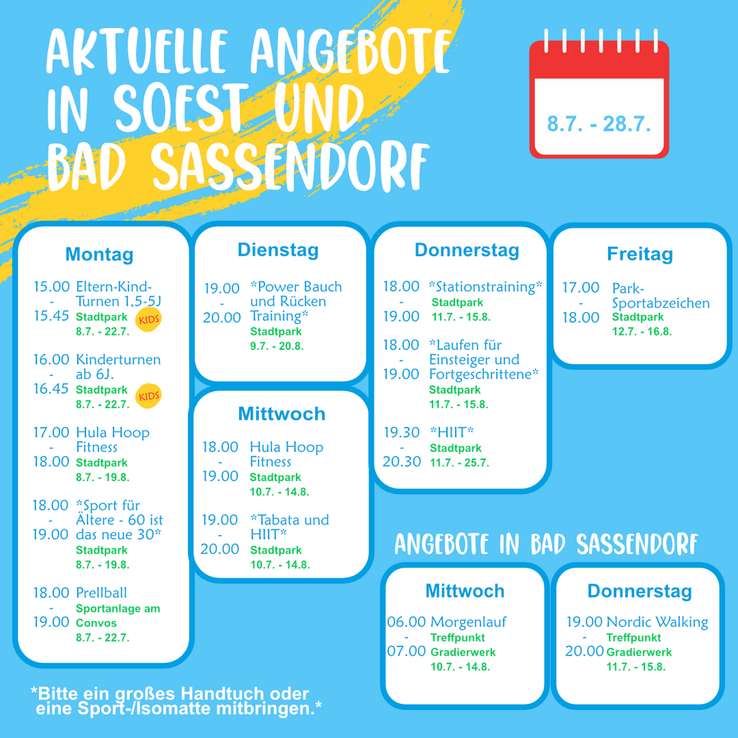 Wie auch in den vergangenen Jahren könnt ihr dieses Jahr in den Ferien in Soest, Bad Sassendorf, Warstein und Lippstadt wieder kostenlos Sportarten ausprobieren. Möglich macht es die Aktion "Sport im Park" des Kreissportbunds. Dabei werden fast täglich verschiedene Sportarten für alle Altersgruppen angeboten. Die Angebote sind kostenlos und anmelden müsst ihr euch auch nicht. Das gesamte Programm findet ihr hier auf unserer Homepage.