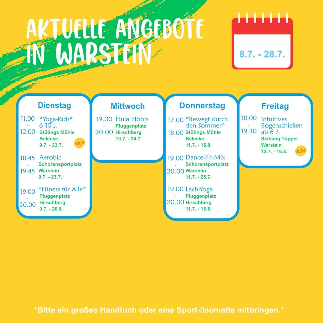 Gehfußball, JuJutsu oder Aerobic: Die gesamten Sommerferien über könnt ihr euch bei der Aktion "Sport im Park" wieder in Gemeinschaft bewegen. In Soest, Lippstadt, Bad Sassendorf und Warstein gibts sechs Wochen lang die unterschiedlichsten kostenlosen Sportangebote. Am Dienstagnachmittag findet in Soest zum Beispiel ein Power-Bauch- und Rückentraining statt. In Warstein gibt es ab 19.00 Uhr Fitness für alle.