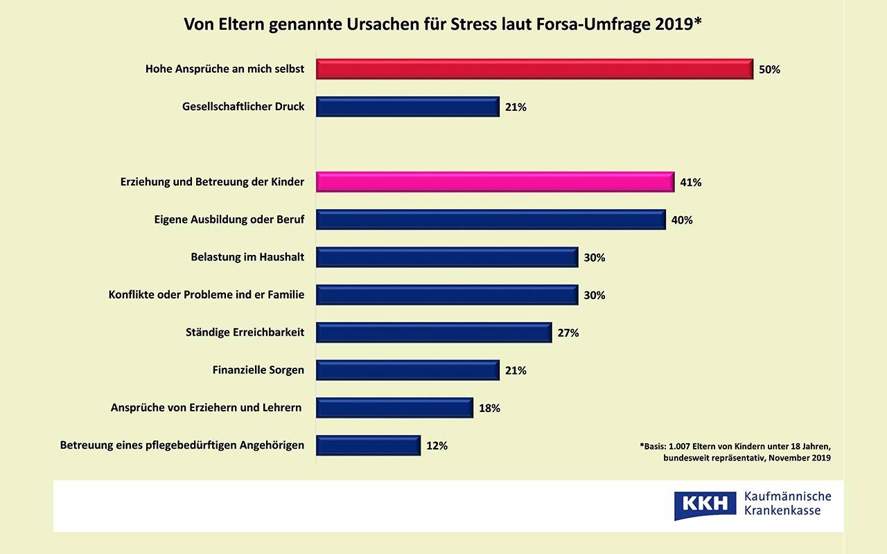 Die Ursachen sind vielfältig: Ärger mit den Kindern, Überlastung bei der Arbeit oder auch Streit mit dem Partner. Eine neue Umfrage von Forsa im Auftrag der KKH Kaufmännische Krankenkasse sagt, dass 40 Prozent der Eltern sehr häufig bis häufig unter Stress leiden. Vor allem die hohen Ansprüche an sich selbst bei der Kindererziehung, den Job und den Haushalt seien ein Problem, sagt rund die Hälfte der gestressten Eltern. Das kann Folgen für die psychische Gesundheit haben. Bevor es hier zu einer Erkrankung kommt, kann es schon erste Warnzeichen geben: extreme Anspannung, niedrige Frustrationsgrenze, Ungeduld, Schlafmangel oder Schmerzen.