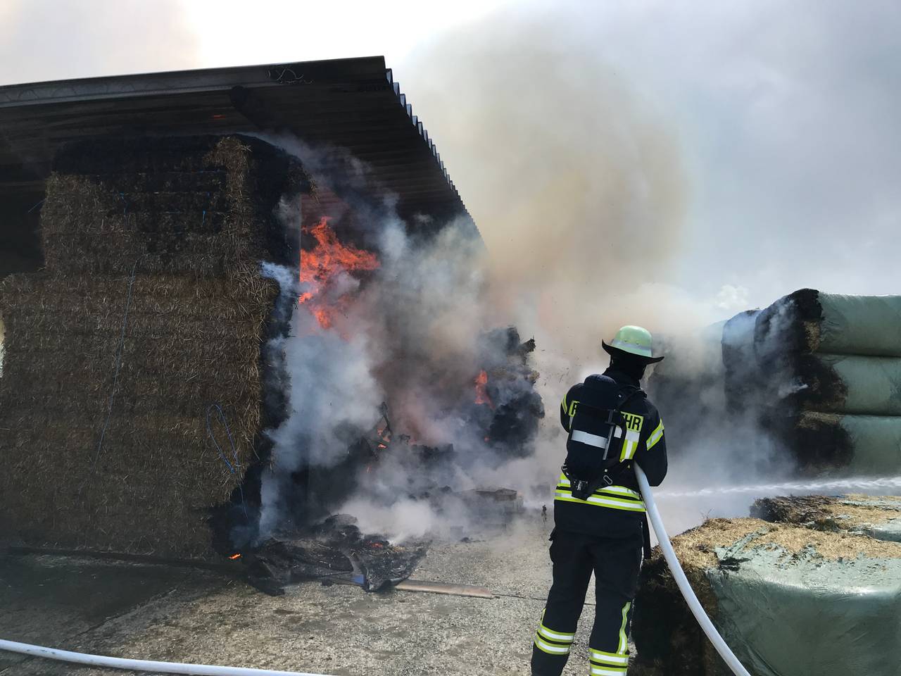 Das Feuer breitete sich auch auf den daneben liegenden Misthaufen aus. Das Feuer wurde von mehreren Trupps unter Atemschutz bekämpft.