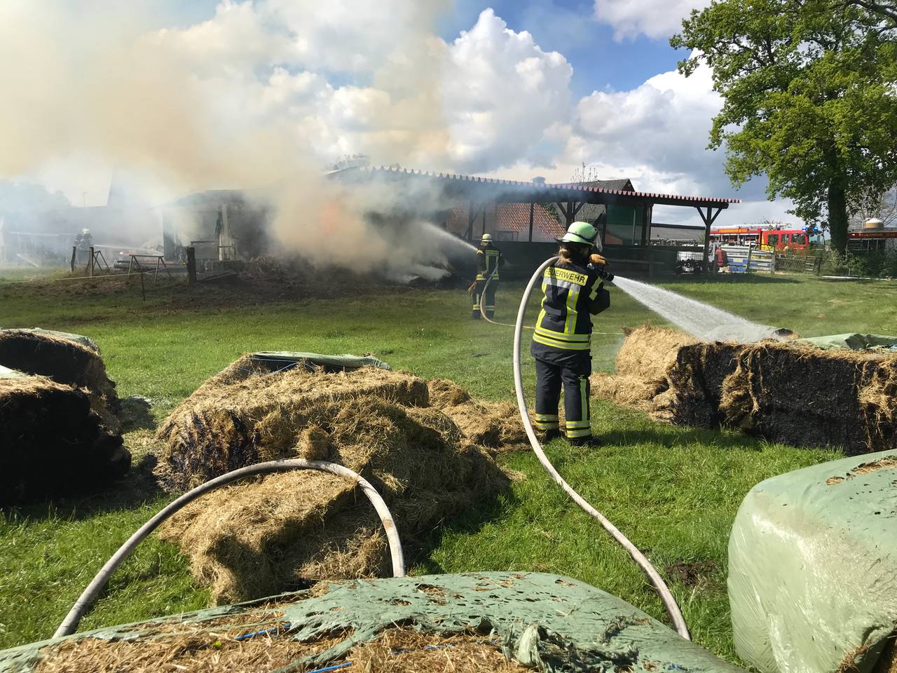 Mit Traktoren wurde das brennende Stroh aus der Scheune gefahren und auf einer Wiese abgelöscht.