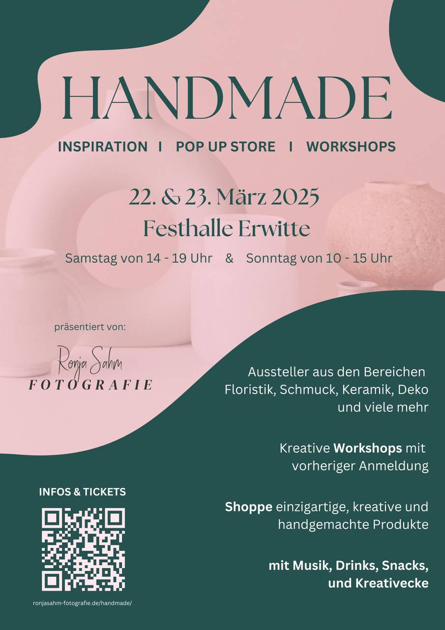 HANDMADE Event in der Festhalle Erwitte Das Handmade Event ist eine einzigartige Mischung aus Pop-up-Store, kreativen Workshops und einer entspannten Atmosphäre, die zum Verweilen einlädt. Was erwartet dich? ✨ Aussteller aus den Bereichen Handgemachtes und Kreatives: Ob Floristik, handgefertigte Keramik, individueller Schmuck, Makramee oder liebevoll gestaltete Kerzen – viele Aussteller verkaufen ihr, mit viel Liebe gemachten Produkte ✨ Kreativworkshops: Lerne etwas Neues und werde selbst kreativ! Angebote wie Yoga & Paint, Sonnenfänger binden und mehr warten auf dich. Wichtig: Die Teilnehmerplätze sind begrenzt, melde dich also frühzeitig über unseren Instagram-Kanal @event.handmade oder per Mail an ronjasahm@gmail.com an, um dir deinen Platz zu sichern. ✨ Mitmachaktionen und Kreativecke: Für alle, die spontan kreativ werden möchten, gibt es unsere kostenlose Kreativecke. Einige unserer Aussteller bieten Mitmachaktionen und Personalisierungen vor Ort an. ✨ Food, Drinks & Musik: Außerdem gibt es leckere Speisen und erfrischende Getränke. DJ Hotte & Seven sorgen mit Musik für eine lockere Atmosphäre – zum Genießen, Verweilen und Inspirieren lassen. ✨ Ein Event für alle – auch für Kinder: Ob du alleine, mit Freunden oder der ganzen Familie kommst – das Handmade Event bietet für jede Generation etwas Besonderes. Wann und wo? ? Festhalle Erwitte ? 22. März 2025 von 14 bis 19 Uhr & 23. März von 10 bis 15 Uhr Bleib auf dem Laufenden! Alle Workshop-Angebote und Updates findest du auf unserem Instagram-Kanal: @event.handmade oder auf: https://ronjasahm-fotografie.de/handmade/ Komm vorbei, wir freuen uns auf dich! ❤️