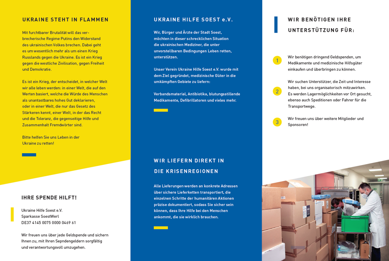 Nach Rücksprache mit Helfern an der polnisch ukrainischen Grenze und in Soest sammelt die Gemeinde haltbare Lebensmittel, Hygieneartikel und Geld zur Unterstützung der Flüchtlinge. Keine Kleidung oder andere Sachspenden. Damit das Geld möglichst schnell vor Ort ist, wird es für diese Hilfe nur in bar angenommen, und zur Hälfte den Maltesern, die bereits vor Ort sind, und der Sternsingeraktion, die konkrete Kontakte nach Polen und in die Ukraine hat, weitergegeben. Wer Geld überweisen möchte, findet andere Hilfsorganisationen und Kontoverbindungen in den Pfarrnachrichten.