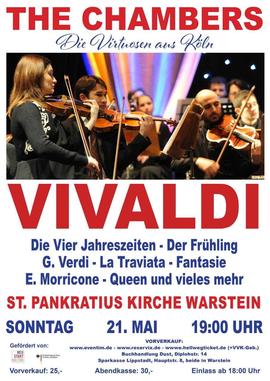 Konzerttipp für Warstein (NRW - Kreis Soest) im Mai: Unser Kammerorchester „The Chambers – die Virtuosen aus Köln“ tritt am Sonntag, dem 21. Mai 2023, um 19.00 Uhr in der St. Pankratius Kirche in 59581 Warstein auf. Die Chambers spielen klassische Musik u.a. von Vivaldi, Verdi und Bach. Dazu können sich die Zuhörer auf vom Ensemble neu arrangierte Stücke von The Queen („The Show must go on“) sowie Ennio Morricone („The Good, the Bad and the Ugly“) freuen. Konzertmeister und Arrangements: Artiom Kononov, Violine. Geplante Instrumentenbesetzung: 4x Violine, Viola, Cello, Bass und Panflöte/Querflöte. Der Vorverkauf ist auf dem Plakat gelistet.