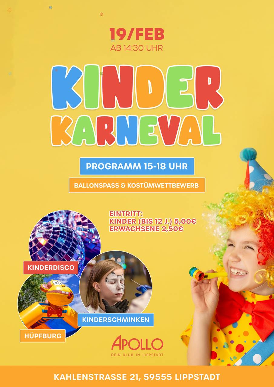 Minis Helau! Hier feiern die kleinen ganz Groß! Es wird so richtig Jeck im Apollo Klub, denn wir verwandeln die Räumlichkeiten in ein echtes Karnevalsparadies und ihr könnt dabei sein. Nicht nur kleinen Gäste heißen wir verkleidet Willkommen, sondern auch die großen Begleiter, dürfen sich gerne verkleiden. Ein Spaß für alle Jecken ob groß oder klein. Unser buntes Program mit DJ, einer Hüpfburg, Kostümwettbewerb, Kinderschminken sorgt für einen tollen Tag! Einlass: 14:30 Uhr Beginn: 15:00 Uhr Eintritt Kinder 5,00 € (bis 12 Jahren) Erwachsene 2,50 € Tickets an der Abendkasse oder in der Apollo Klub App!