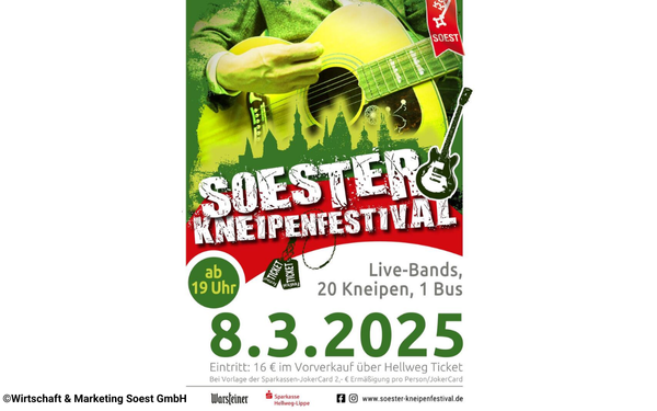Live-Musik in Kneipen - das kommt im Kreis Soest erfahrungsgemäß gut an. In Soest wird am 8. März 2025 das beliebte Kneipenfestival stattfinden. Der Vorverkauf hat bereits begonnen, und es werden rund 5.000 Besucher erwartet. 20 Kneipen bieten eine bunte Mischung aus Rock, Pop, Blues und Jazz. Ein Festival-Bus sorgt für den Transport zwischen den Locations und bietet ebenfalls Live-Musik. Es lohnt sich, mit dem Kartenkauf nicht zu lange zu warten: Das Festival ist traditionell schnell ausverkauft, sagt Michael Schiewe der Leiter des Soester Veranstaltungsbüros: Hier könnt ihr euch Tickets kaufen und findet alle Infos.