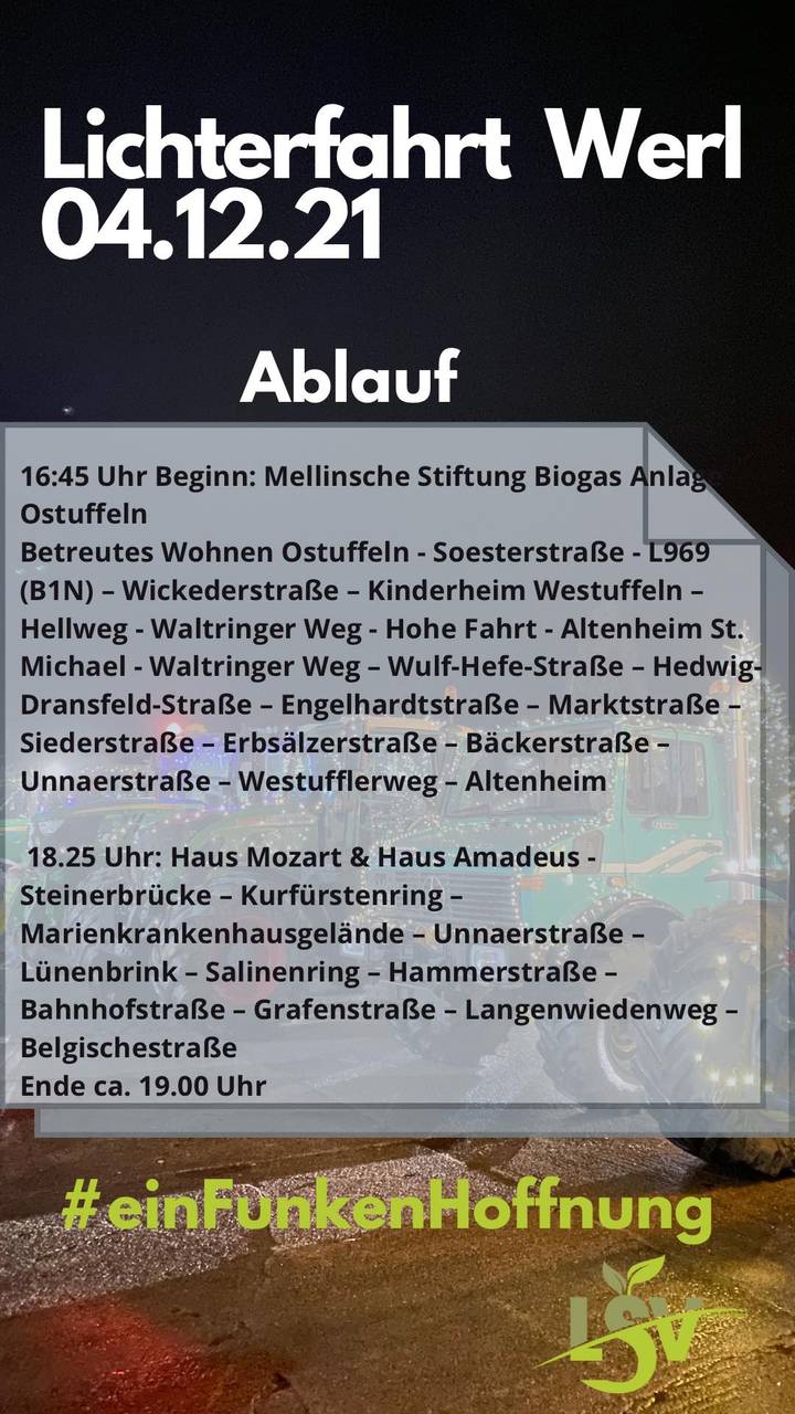 Beleuchtete Trecker und Weihnachtsmusik. Die Landwirte im Kreis Soest veranstalten ab heute an verschiedenen Orten bei uns Weihnachtsumzüge. Bei der Aktion "Ein Funken Hoffnung" fahren sie in einem Umzug aus beleuchteten Treckern durch die Region. Bereits im letzten Jahr haben sich viele über die Aktion gefreut, weiß Organisatorin Martina Schäfermeier: "Vom letzten Jahr haben wir eine so große Resonanz zurückbekommen. Das hätten wir überhaupt nicht erwartet, das war so toll. Die Leute haben vor ihren eigenen Gärten gestanden, mit 'nem Glühwein in der Hand, oder mit 'ner Wunderkerze, haben Weihnachtslieder gesungen. Und das ist eigentlich der Hauptgrund, warum wir das dieses Jahr wieder machen." Der erste Umzug ist heute (03.12.) ab 16 Uhr in Lippstadt. Morgen sind die Landwirte in und um Soest, Werl, Geseke, Erwitte und Warstein unterwegs.