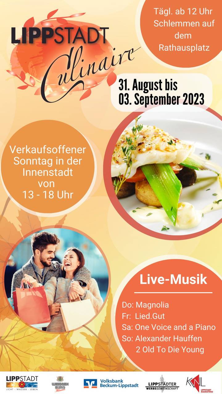 Liebe Gäste aus nah und fern, ein heißer Sommer neigt sich dem Ende zu und der Herbst steht vor der Tür – wie doch die Zeit vergeht. Deshalb ist es Zeit innezuhalten und zu genießen! Wir in Lippstadt laden Sie sehr herzlich zu unserem traditionellen Schlemmer- und Shoppingwochenende ein. Lassen Sie uns nach den letzten schwierigen Jahren endlich wieder so richtig leben - ein schönen Glas Wein und richtig gutes Essen gehören einfach dazu. Die Lippstädter Werbegemeinschaft und Lippstadt Marketing laden Sie sehr herzlich zu Lippstadt Culinaire ein, vom 31. August bis 3. September auf dem Rathausplatz mit dem verkaufsoffenen Sonntag. Unsere vier Gastronomen Altes Gasthaus Voss, Auer Catering & Eventservice GmbH, Cosacks Brennerei und der Hülshoff werden ihre Kochkünste präsentieren und ihre Gaumen mit einer kulinarischen Vielfalt an Essen und Getränken verwöhnen. Für einen vielseitigen, musikalischen Genuss haben wir ebenfalls gesorgt. Von der asiatischen Kokos-Currysuppe mit Garnelen, über echte Klassiker wie die französische Entenbrust auf Bandnudeln mit Balsamico Jus, das echte Wiener Schnitzel mit Kartoffelsalat bis zum Himbeer-Mascarpone-Prosecco-Traum ist für jeden Geschmack das Richtige dabei. Das große, herbstlich stimmungsvoll dekorierte Zelt auf dem Rathausplatz sorgt für eine gemütliche Stimmung bei jedem Wetter. Mit dem Beginn der Herbstsaison präsentiert ihnen die Lippstädter Kaufmannschaft die neuen Kollektionen im Bereich Mode, Sport, Schuhe, Deko und Accessoires – sie können in den vielseitigen Geschäften in Lippstadt nach Herzenslust bummeln. Am beliebten verkaufsoffenen Sonntag öffnen die Geschäfte in der Innenstadt von 13 bis 18 Uhr. Lippstadts historische Altstadt bietet Ihnen dabei den Rahmen für ein schönes Einkaufserlebnis. Als kleines Dankeschön für ihren Besuch verteilen wir in den Geschäften der Lippstädter Werbegemeinschaft die beliebten Verzehrgutscheine im Wert von 1,- €. Die Gutscheine können bei den vier Gastronomen eingelöst werden. Somit steht einer genussvollen Einkehr, unter dem stimmungsvoll dekorierten Zeltdach, nach einer ausgiebigen Einkaufstour nichts mehr im Wege. Wir laden Sie sehr herzlich in unsere wunderschöne Lippe-Stadt ein, genießen Sie am Rathausplatz Open Air Genuss und shoppen Sie in unserer schönen Innenstadt. Schlemmen Sie nach Herzenslust und lassen Sie Ihre Seele bei schöner Musik baumeln.