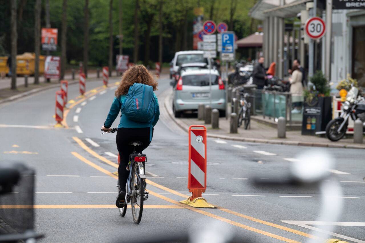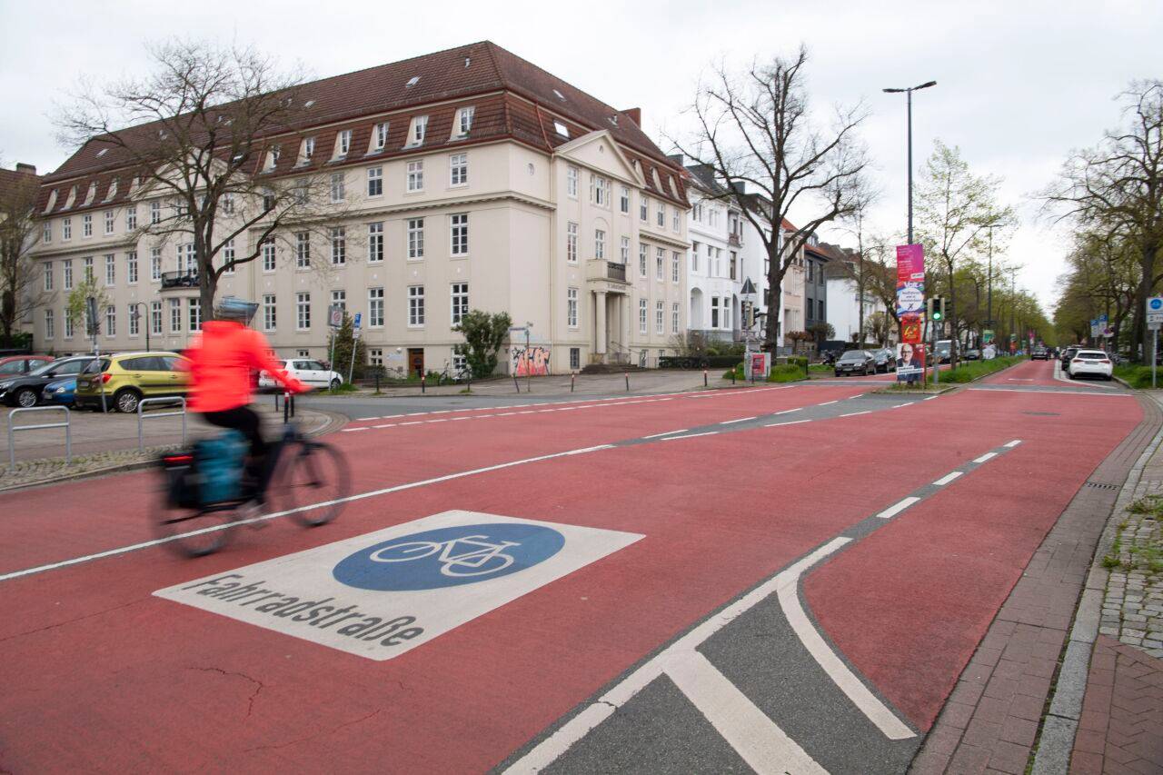 Eine Fahrradfahrerin fährt durch eine deutsche Innenstadt. Sie erhält dabei freie Fahrt, da sie eine eigene Spur bekommt.