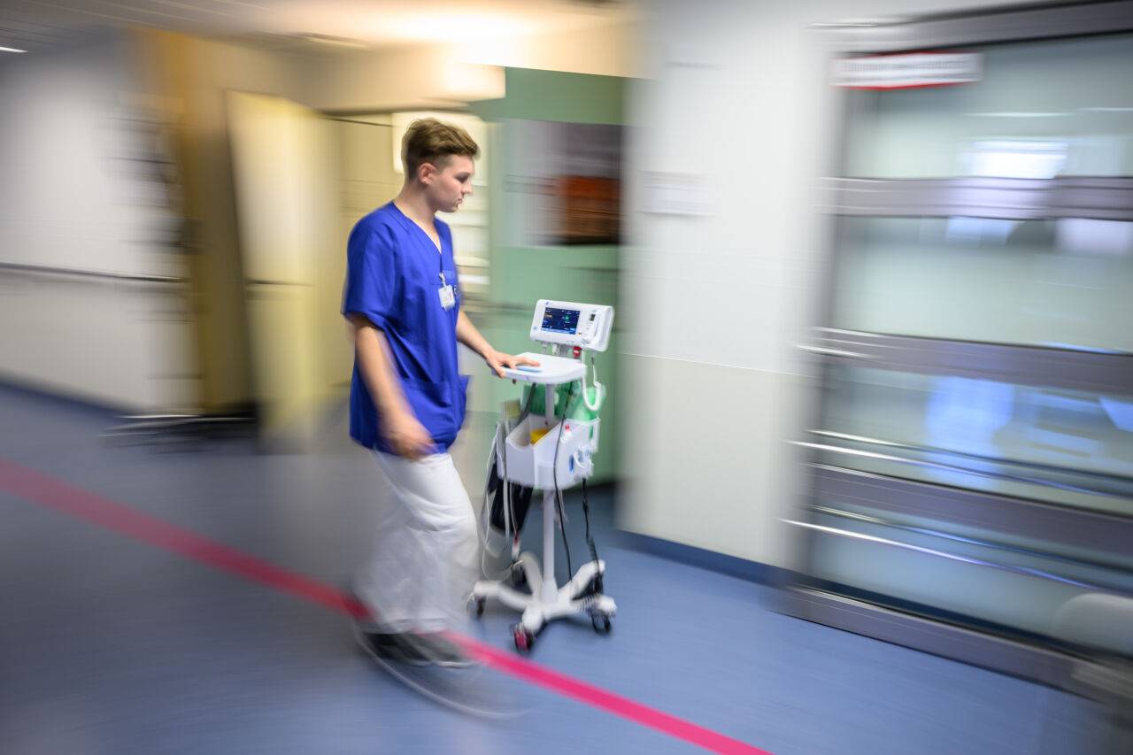 Ein Krankenhaus-Mitarbeiter beziehungsweise Pfleger ist im Krankenhaus zu sehen.
