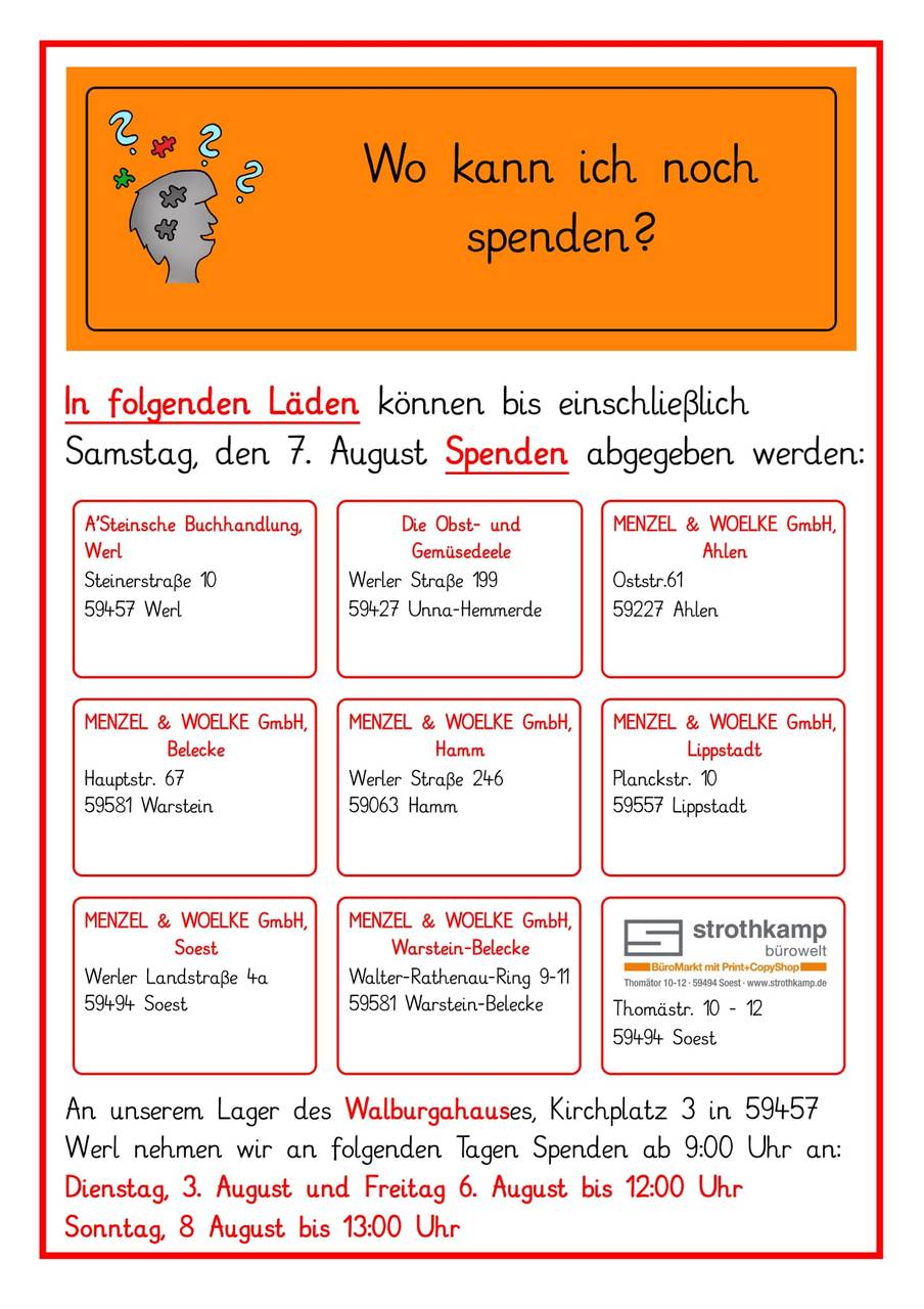 Die Pfarrjugend St. Walburga in Werl sammelt weiter Schulmaterial für Kinder aus den Hochwassergebieten. Noch bis 17 Uhr werden die Spenden heute (02.08.) persönlich in Soest am Parkplatz der Caritas in der Osthofenstraße entgegengenommen. Gebraucht werden gut erhaltene Tornister und die üblichen Schulsachen wie Stifte, Hefte oder Malsachen. Die Spenden gehen ins schwer betroffene Swisttal im Rhein-Sieg-Kreis. Wer heute nichts dorthin bringen kann, kann die Spenden auch nachträglich noch in teilnehmenden Einzelhandelsgeschäften abgeben. Wo das geht, seht ihr in der Grafik hier (anklicken für Vollbild):
