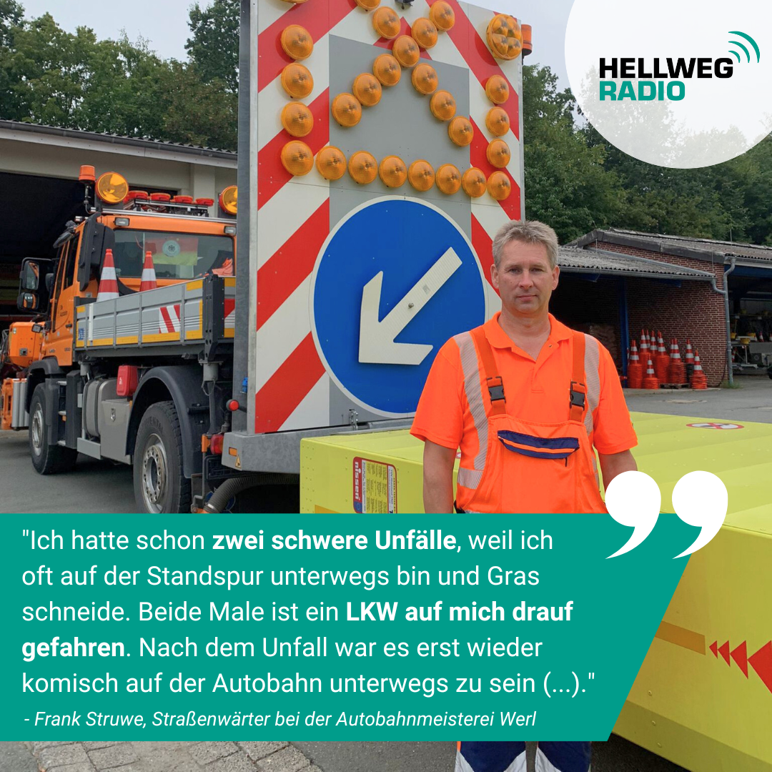 Immer wieder kracht es: Im vergangenen Jahr waren Straßenwärter der Autobahn-Niederlassung Westfalen in 40 Unfällen verwickelt. Schuld tragen meistens unachtsame Autofahrer, die die Arbeiter auf den Autobahnen übersehen. Frank Struwe von der Autobahnmeisterei Werl hat die Gefahr seines Jobs am eigenen Leib erfahren müssen. Zweimal wurde er von LKW angefahren. Danach hatte er Schürfwunden am Hinterkopf und einen stark geprellten Ellbogen.