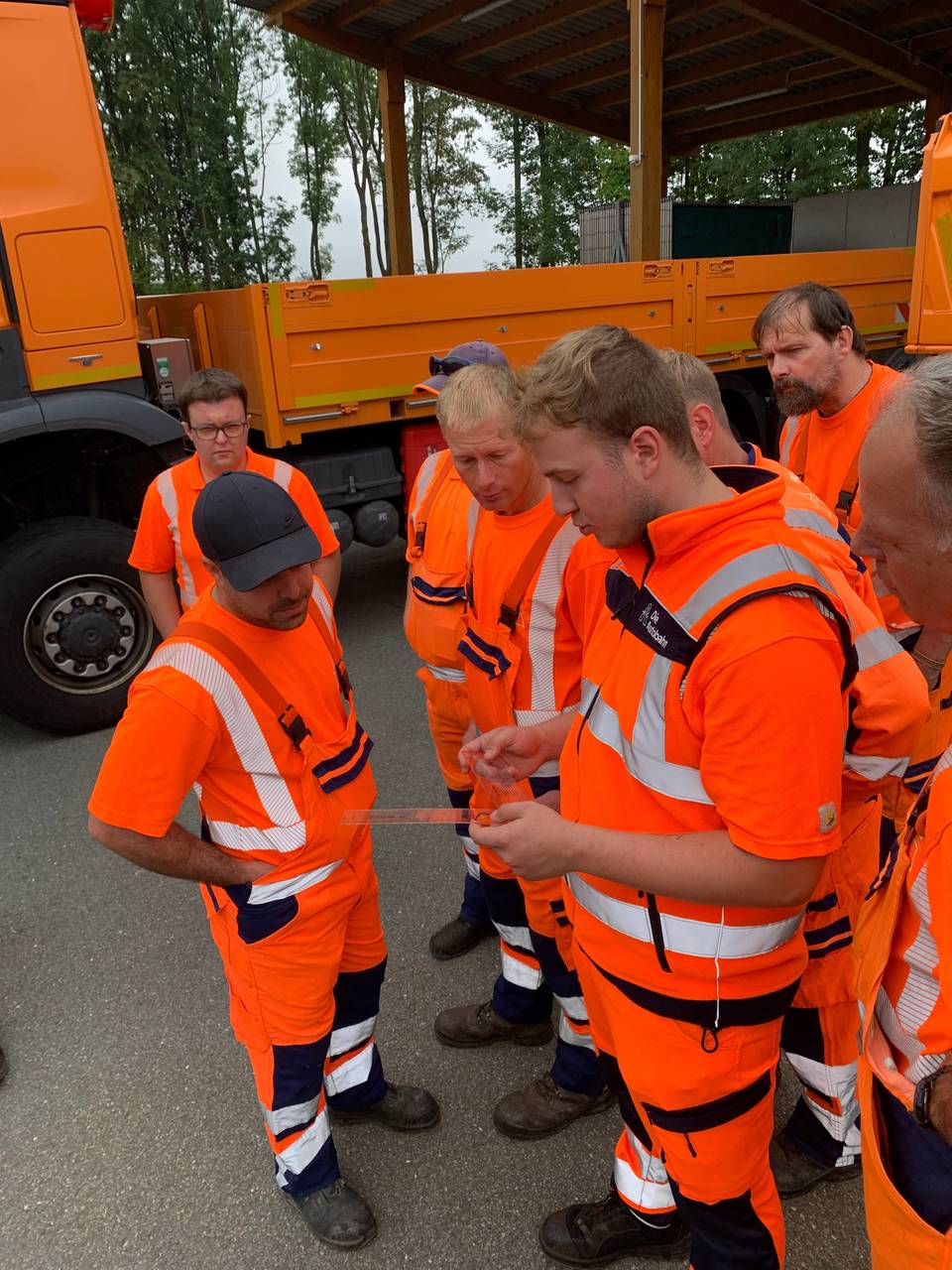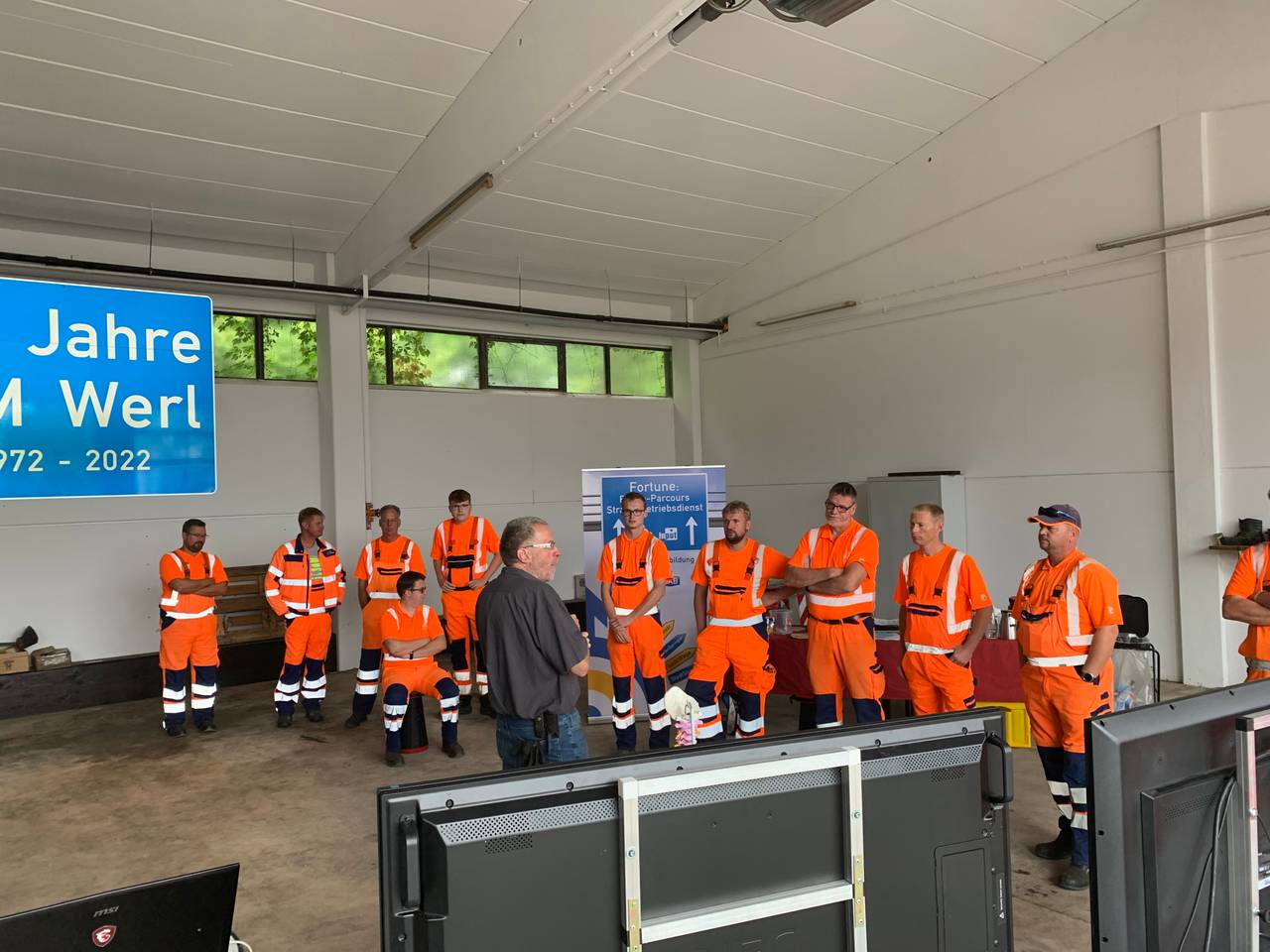 40-Tonner rasen mit 100 km/h an ihnen vorbei, während sie an der Mittelleitplanke Gräser zurückschneiden: Der Beruf der Straßenwärterinnen und Straßenwärter ist mit einem großen Sicherheitsrisiko verbunden. Um den Umgang mit Gefahrensituationen zu üben, gab es gestern (16.08.) in der Werler Autobahnmeisterei ein spezielles Training. Dabei geht es vor allem um den Erfahrungsaustausch unter den Kollegen. Neben dem richtigen Verhalten auf dem Seitenstreifen wurden auch die richtige Sitzeinstellung der LKW und das Überqueren der Leitplanken thematisiert.