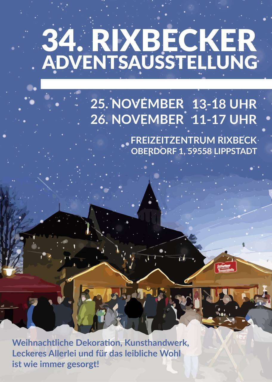 Öffnungszeiten: Samstag 25. November 13:00 bis 18:00 Uhr Sonntag 26. November 11:00 bis 17:00 Uhr Wenn am 25. November der Duft von Glühwein und Lebkuchen durch das Rixbecker Freizeitzentrum zieht, dann ist es wieder soweit, die Rixbecker Adventsausstellung ist eröffnet. Zum 34. Mal, können sich die Besucher am Samstag den 25. November von 13:00 bis 18:00 Uhr und am Sonntag den 26. November zwischen 11:00 und 17:00 Uhr auf ein abwechslungsreiches Angebot, der diesjährigen Aussteller freuen. An über 30 Ständen, präsentieren die Aussteller im diesem Jahr, selbst gemachte Marmeladen, adventliche Gestecke, Dekorationen aus Holz oder Beton, Schmuck, Liköre, selbstgebackene Plätzchen und Torten, Bratkartoffeln mit Leberkäse, süße Donuts und kleine Pfannkuchen „Püfferken“, die herzhafte Lauchsuppe von den Rixbecker Pfadfindern und vieles mehr. In der Cafeteria, erwartet die Besucher ein köstliches Angebot an Kuchen, Torten und heißen Waffeln. Das Team der Rixbecker Adventsausstellung, freut sich auf Ihren Besuch.