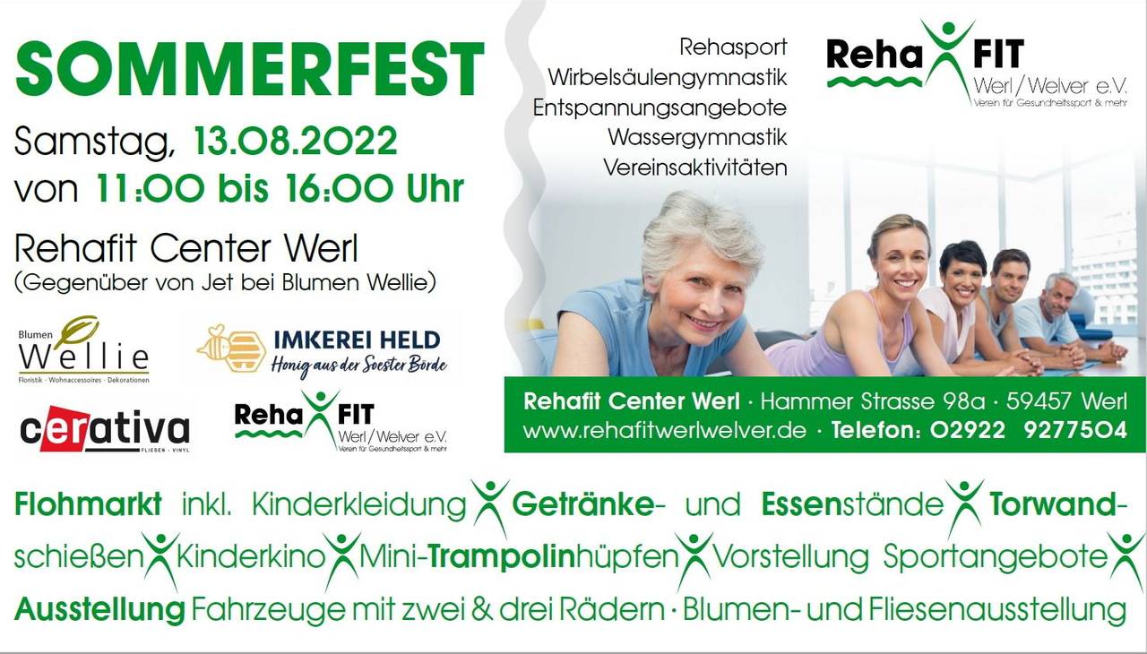 Der Verein Rehafit Werl Welver, größter Rehasport Anbieter in Werl, veranstaltet sein erstes Sommerfest am Samstag, den 13.August 2022 und lädt alle Bürger/innen herzlich dazu ein.