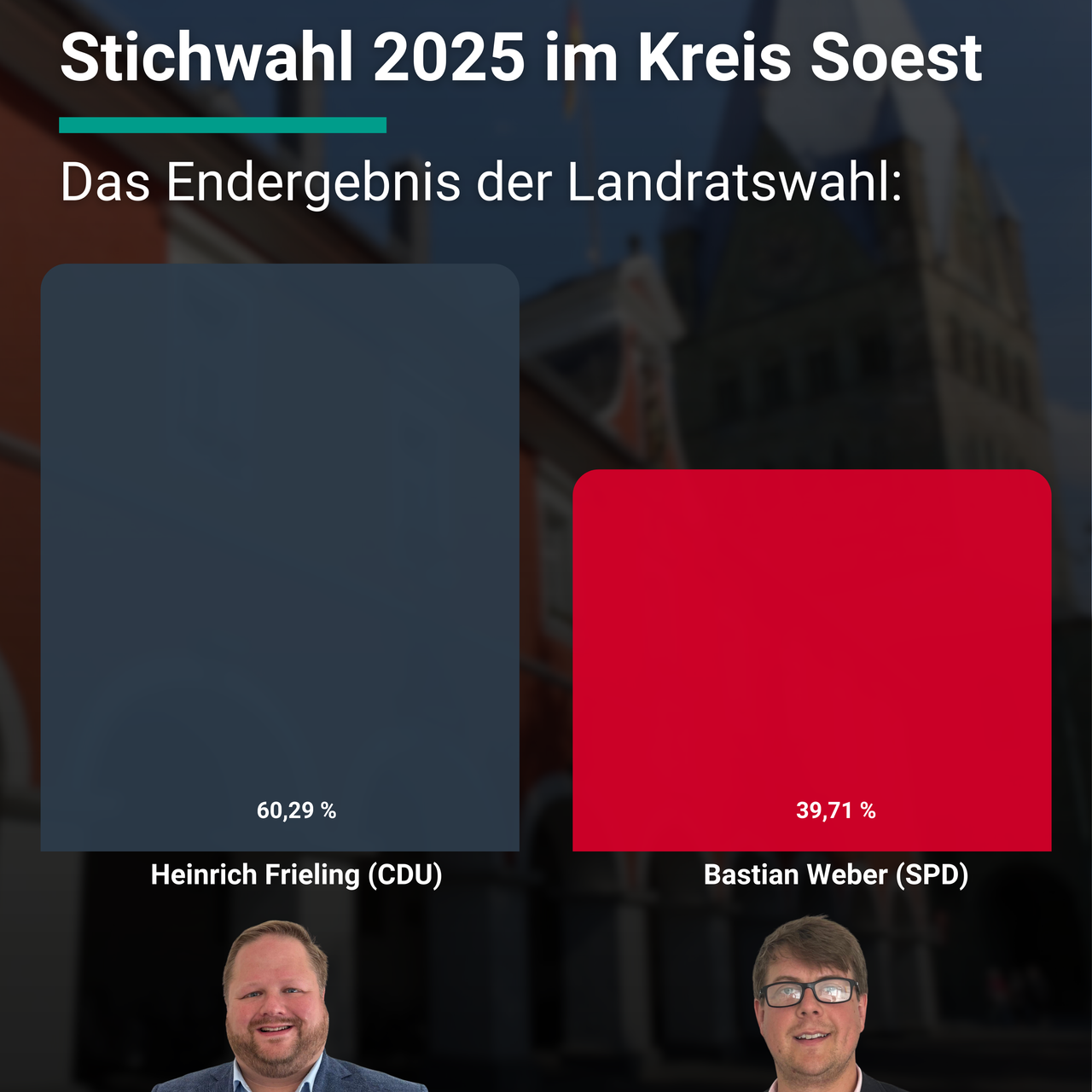 Für den Kreis Soest wird CDU-Politiker Heinrich Frieling aus Ense neuer Landrat. Er gewann die Stichwahl gegen SPD-Kandidat Bastian Weber mit klarem Vorsprung: 60,29 Prozent der Stimmen gingen an ihn, Weber kam auf 39,71 Prozent. Die Wahlbeteiligung lag bei 36,5 Prozent.
