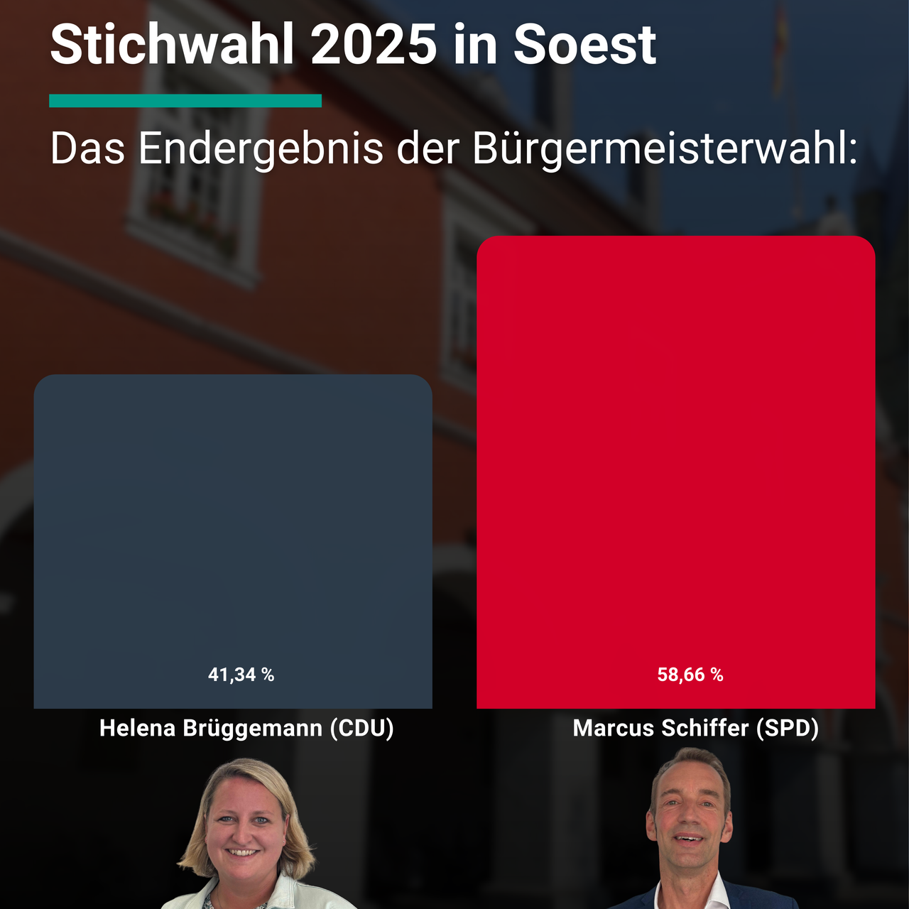 Auch in Soest stand ein Wechsel an: SPD-Kandidat Marcus Schiffer setzte sich deutlich gegen CDU-Bewerberin Helena Brüggemann durch. Mit 58 Prozent der Stimmen wird er Nachfolger von Eckhard Ruthemeyer, der seit 1999 Bürgermeister der Kreisstadt war. Schiffer wird damit der erste SPD-Bürgermeister in Soest seit diesem Jahrtausend. Nach der Verkündung der Ergebnisse gab es im Blauen Saal im Soester Rathaus großen Jubel. Schiffer zeigte sich überwältigt von seiner Wahl und tritt das Amt offiziell am 1. November an.