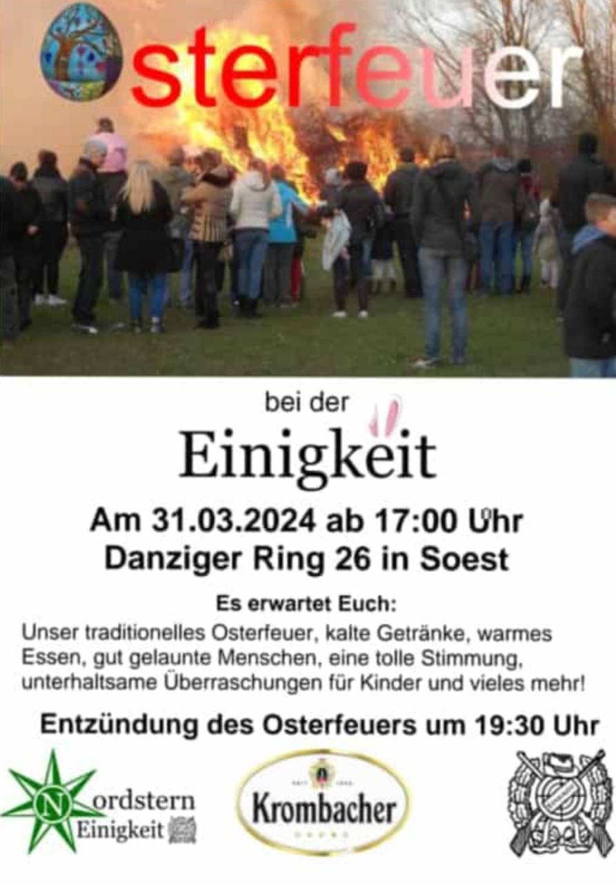 Auch in diesem Jahr findet das tradionelle Osterfeuer am Danziger Ring in Soest statt. Es erwarten Euch kalte Getränke, warmes Essen, eine tolle Stimmung und gaaanz viel gute Laune. Selbstverständlich hat der Schützenverein Einigkeit Soest 1926 e.V. sich wieder kleine Überraschungen für die Kinder ausgedacht. Beginn ist am 31.03.2024 ab 17.00 Uhr. Um ca. 19.30 Uhr wird das Feuer entzündet.