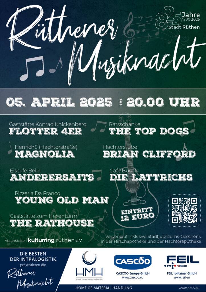 Die Rüthener Musiknacht ist zurück. Am Samstag, 5. April, ab 20 Uhr soll das beliebte Kneipenfestival in der Rüthener Innenstadt nach einigen Jahren Pause wieder stattfinden, wie die Organisatoren mitteilten. Musikfreunde, Kneipengänger und alle kontaktfreudigen Menschen können sich den Termin schon mal vormerken, Karten werden zeitig schon im Vorverkauf erhältlich sein. Mit seinem Comeback möchte das Kneipenfestival nicht kleckern, sondern ordentlich etwas los machen. Acht Kneipen und acht Bands sind bei dem Revival der Musiknacht eine Rekordbeteiligung. Den Gästen werden abwechslungsreiche Locations sowie ein breit gefächertes musikalisches Spektrum geboten. Mit dabei sind die Gaststätte Konrad Knickenberg, die Hachtorstube, die Ratsschänke, die Gaststätte am Hexenturm (ehemals Kolpinghaus) und Café Buuck. Neu machen die Pizzeria da Franco und das Eiscafé Bella mit und auch das Henrichs lädt in der Hachtorstraße (gegenüber Haus Buuck) zu Musik, Tanzen, kühlen Getränken und Leute treffen ein. Musikalisch gibt es ein Wiedersehen mit den Top Dogs, der lokal-regionalen Band Anderersaits und Den Lattrichs. Es gibt Höhepunkte aus Rock und Pop der vergangenen Jahrzehnte, reichlich gute Top-40-Musik, aber auch handgemachte Klänge von der irischen Insel und dem Sänger Brian Clifford, Covermusik von den Doors – oder die Gäste können einfach mit der Band Flotter Vierer auf und neben der Tanzfläche ordentlich abgehen, verraten die Organisatoren schon vorab.