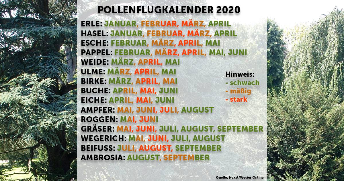 Die Übersicht des Pollenflugkalenders für 15 verschiedene Blüten. Quellen: Hexal/Wetter Online.