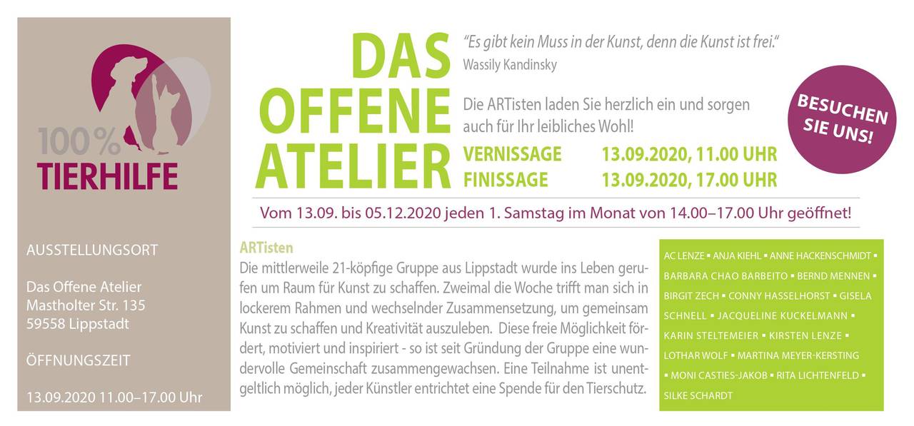 Neu ist in diesem Jahr, dass vom 13.09.2020 bis zum 05.12.2020 zusätzlich jeden 1. Samstag im Monat, in der Zeit von 14 bis 17 Uhr das Atelier für Besucher geöffnet ist. Trotz Corona - die Zeit steht nicht still. Lassen Sie uns die grauen Zeiten etwas bunter machen. ARTisten eine eine mittlerweile 21-köpfige Gruppe aus Lippstadt, die ins Leben gerufen wurde um Raum für Kunst zu schaffen. Zweimal die Woche trifft man sich in lockerem Rahmen und wechselnder Zusammensetzung, um gemeinsam Kunst zu schaffen und Kreativität auszuleben. Die Teilnahme ist unentgeltlich möglich, jeder Künstler entrichtet eine Spende für den Tierschutz.