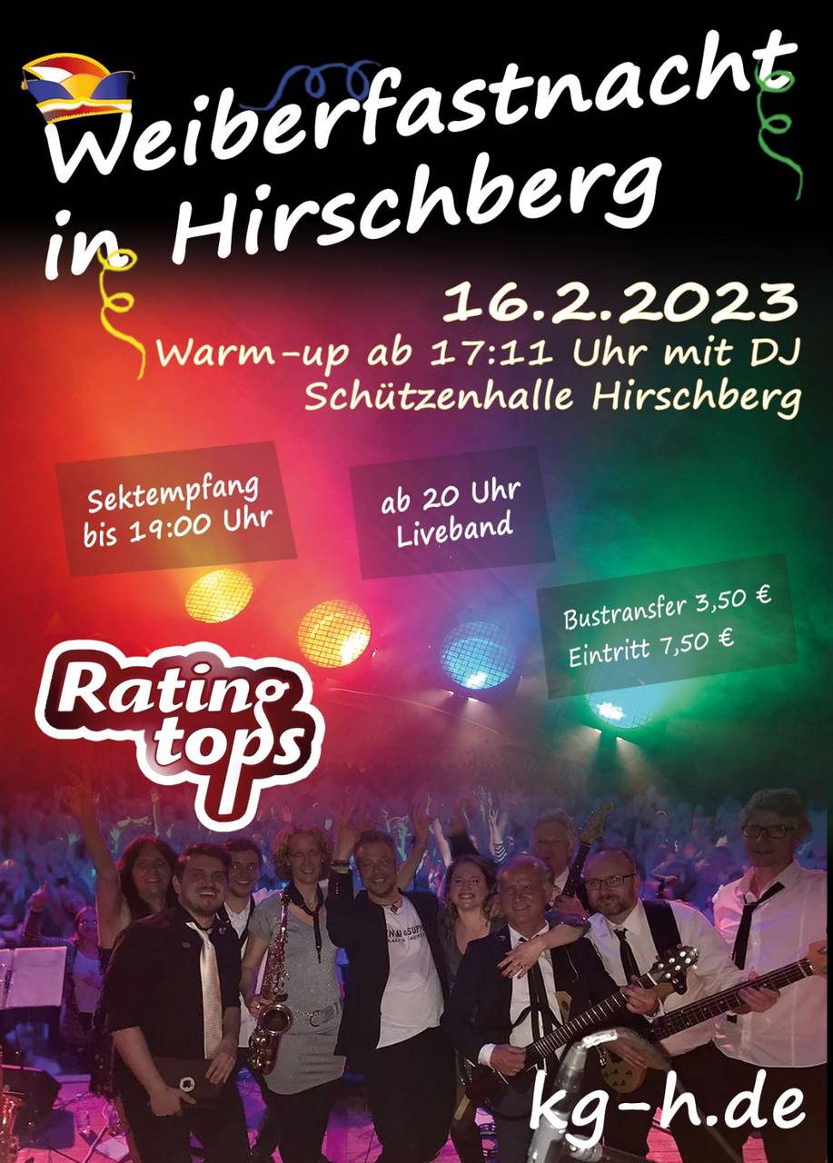 Der Weiberball in Hirschberg bleibt!! Auch nach dem Lockdown wollen wir weiterhin eine tolle Party mit euch feiern! Wie immer lassen wir es ordentlich krachen. Das Konzept bleibt und ihr könnt euch auf eine geile Party freuen! Nachdem um 16:30 Uhr der neue Hoppeditz an Krämes Giebel hochgezogen wird, starten wir um 17:11 Uhr in der Schützenhalle mit der WarmUp Party mit DJ. Ab 20 Uhr erwartet euch dann wie immer eine Liveband. Für Weiberfast 2023 konnten wie die kölner Band "Rating Tops" verpflichten. Mehr Infos über die Band und den Bustransfer gibt es unter www.kg-hirschberg.de Natürlich hat die Nacht kein Ende. Damit ihr komplett eskalieren könnt, übernimmt nach der Band wieder der DJ. Der Mix aus DJ und Band verspricht eine grandiose Party, bei welcher für jeden etwas dabei ist. Egal ob die kölschen Klassiker, Rock und Pop sowie die aktuellen Top Hits aus dem 17 Bundesland Malle. Eins ist klar! Nicht nur der Elferrat, auch unser Festwirt ist startklar und weiß, wie der Hase läuft. Egal ob Bier, Longdrinks oder Cocktail. Alles in ordentlicher Spitzenqualität. ALSO, nehmt teil an dieser grandiosen Veranstaltung! Wir freuen uns auf euch!