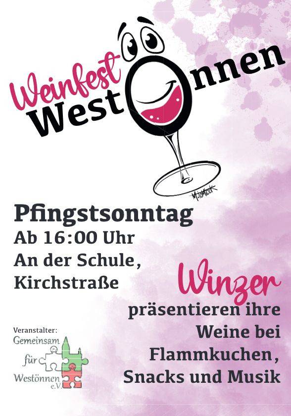 In Geseke, Werl-Westönnen und in Möhnesee-Körbecke gab es dieses Jahr schon Weinfeste. In diesem Jahr hat zum dritten Mal das Weinfest in Westönnen stattgefunden. Immer Pfingstsonntag lädt der Verein Gemeinsam für Westönnen e.V. zu diesem Fest nach Westönnen ein.
